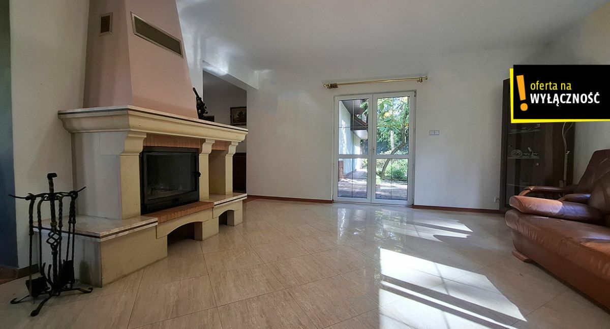 W salonie znajduje się kominek wykonany z żółtego piaskowca z elementami marmuru i cegły.