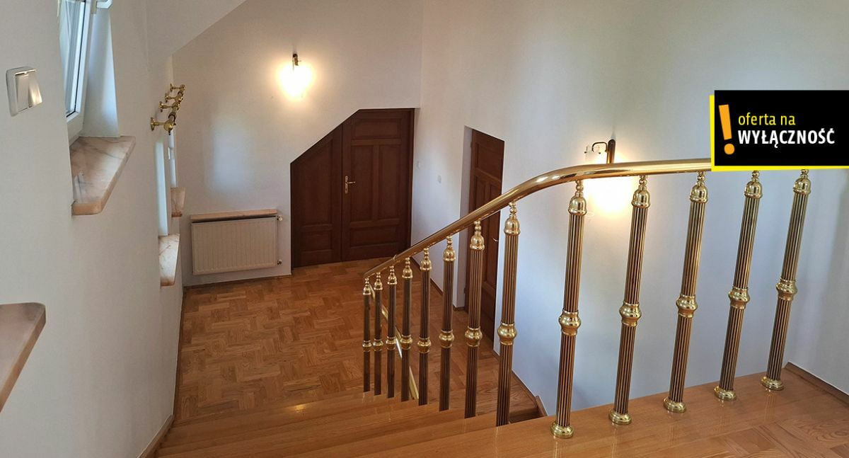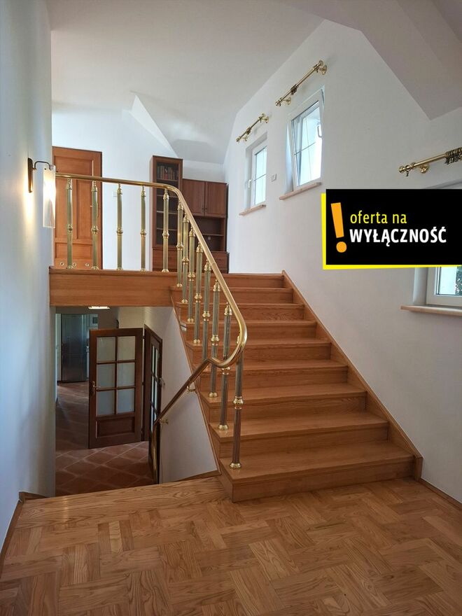 Schody drewniane (balustrady mosiężne). Gładzie na ścianach.